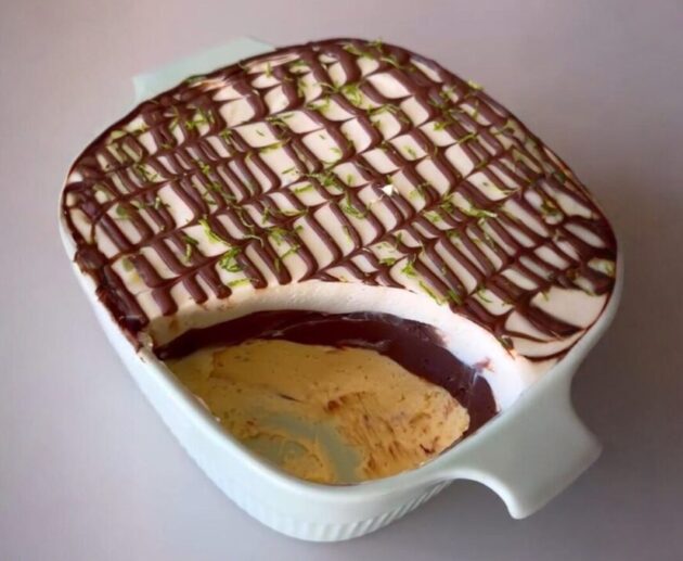 Sobremesa incrível de três camadas: mousse de maracujá, ganache de chocolate e mousse de limão.