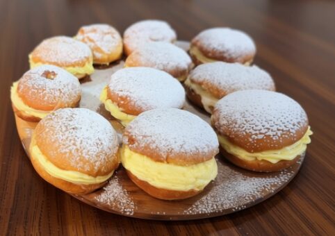 Receita de sonho caseiro e fofinho, recheado com um creme aveludado de baunilha.