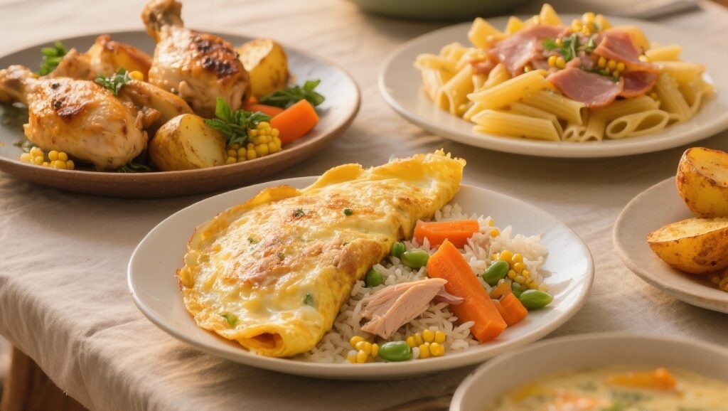 Restos de arroz podem virar bolinhos, frango pode ser desfiado para recheios, e legumes podem ser transformados em sopas ou purês. Use a criatividade!