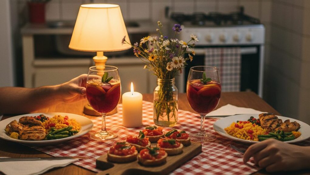 Uma toalha bonita, velas, flores ou até um arranjo improvisado com o que você tem em casa criam o clima romântico sem gastar quase nada. A forma como a comida é servida também valoriza o jantar.