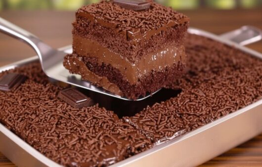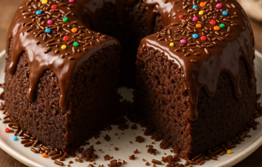 Bolo fofo e úmido que derrete na boca com cobertura cremosa de chocolate, perfeito para reviver a infância e adoçar o dia com afeto.