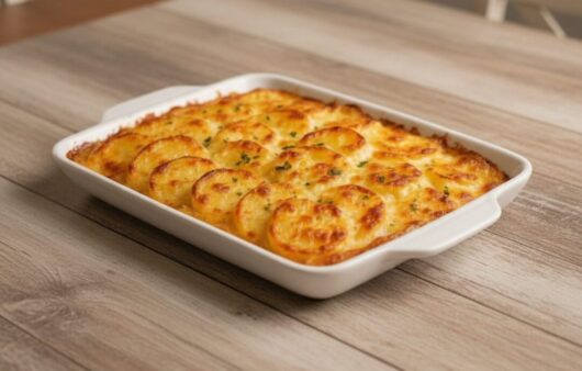 Batata em fatias finas assada em um molho cremoso de creme de leite e leite, temperada com alho e noz moscada. Fica super cremosa e gratinada.