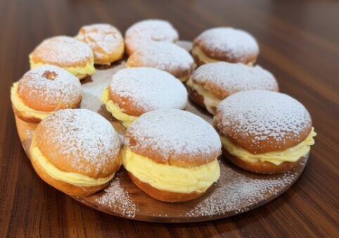 Receita de sonho caseiro e fofinho, recheado com um creme aveludado de baunilha.