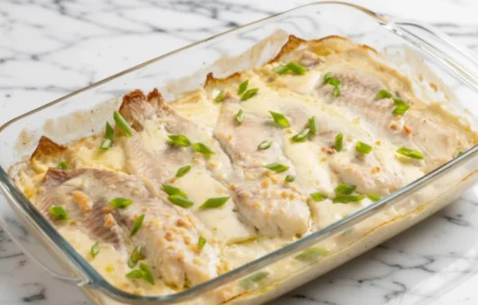 Filé de tilápia assado em um creme saboroso feito com sopa de cebola, leite e creme de leite, prático para o dia a dia.
