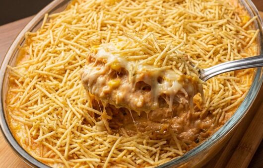 Um prato clássico de forno que combina frango desfiado com um creme de milho aveludado, coberto com queijo derretido e batata palha crocante.