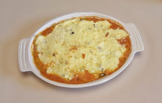 Filé de tilápia assado sob um molho de tomate caseiro e coberto com um purê de batatas cremoso e gratinado.