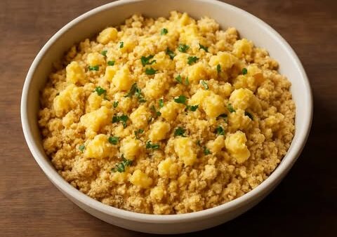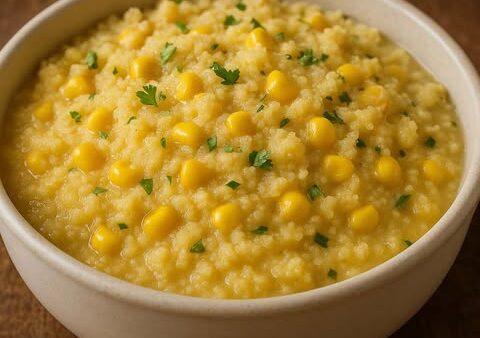 Farofa cremosa de milho com toque de manteiga, macia e saborosa, perfeita para complementar carnes e tornar o churrasco ainda mais especial.