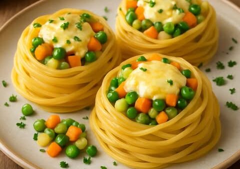 Ninhos de macarrão recheados com legumes frescos e queijo derretido, nutritivos, coloridos e fáceis de preparar, perfeitos para refeições práticas e saborosas.