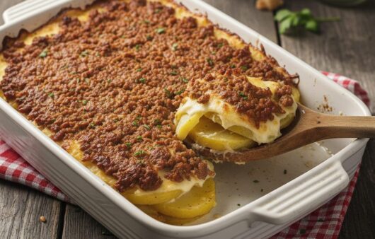 Manta de linguiça com batatas, macia e douradinha, coberta com um creme de queijo caseiro. Uma receita de conforto, econômica e perfeita para um almoço saboroso e sem complicação.
