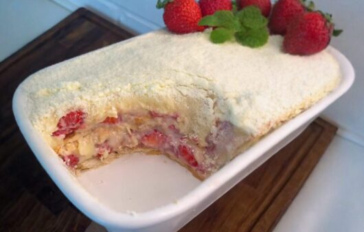 Um pavê cremoso, sem ovos, que combina o sabor clássico do leite em pó com a acidez do morango em camadas deliciosas.