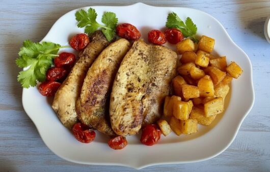 Filé de tilápia suculento, marinado em um molho fresco de coentro e vinho branco, assado com batatas e tomatinhos.