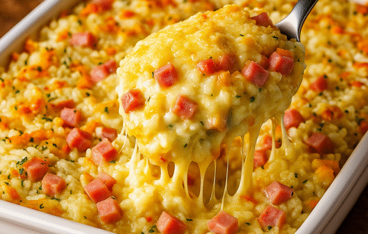Arroz gratinado com queijo e presunto, cremoso e cheio de sabor, ideal para transformar qualquer refeição em um momento reconfortante.