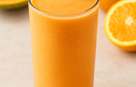 Vitamina doce e refrescante com mamão e laranja, rica em vitaminas e fibras, perfeita para começar o dia de forma saudável e econômica.