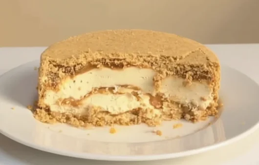 Uma torta que inverte a lógica do sabor, com base crocante, um creme de cheesecake com chocolate branco e camadas generosas de doce de leite.
