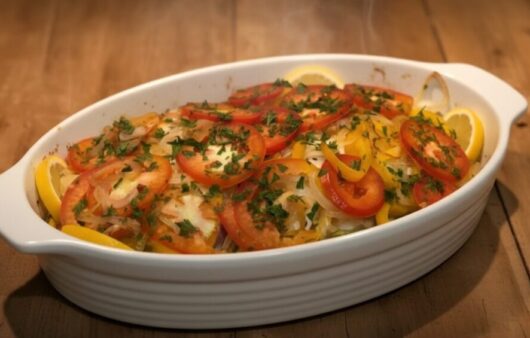 Um prato leve e saudável de filé de peixe assado com vegetais frescos e temperos simples, perfeito para um almoço prático.