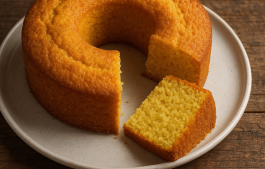 Bolo fofinho e dourado de fubá, preparado sem leite, fácil de fazer e cheio de sabor tradicional que combina com qualquer café da tarde.