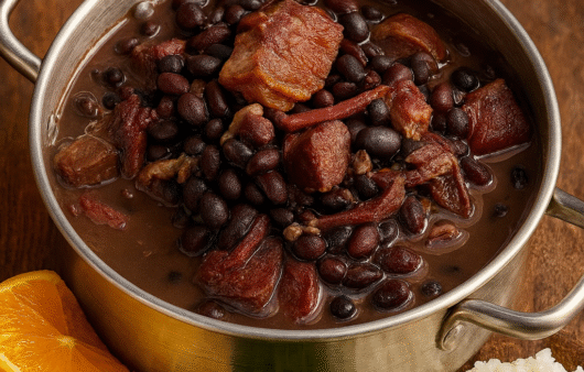 Feijão-preto cozido com carnes defumadas e salgadas em um caldo encorpado, acompanhado de arroz branco, couve refogada, farofa e gomos de laranja.