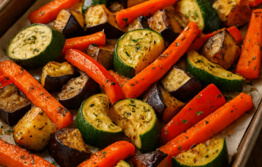 Legumes assados coloridos e crocantes por fora, macios por dentro, temperados com ervas frescas e azeite, prontos para acompanhar qualquer refeição ou servir como prato principal nutritivo e econômico.