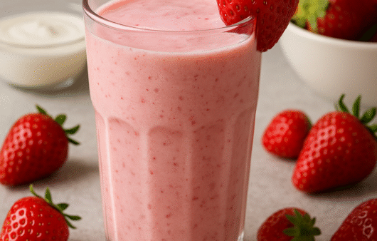 Vitamina cremosa e refrescante com morango e iogurte, nutritiva e econômica, ideal para começar o dia com sabor e saúde.