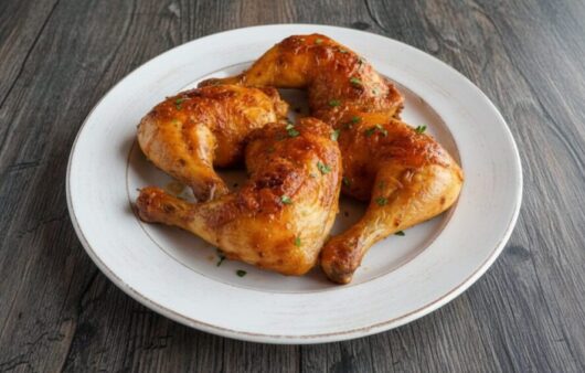 Coxa e sobrecoxa de frango assada, temperada com alho, limão e salsinha, cozida em duas etapas para ficar macia por dentro e dourada por fora.