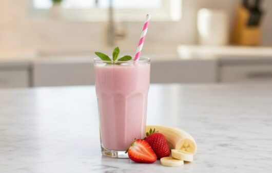 Smoothie vitamínico e refrescante, feito com morango, banana, mel e aveia. É uma opção nutritiva e rápida para o café da manhã ou lanche.